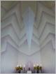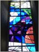 Im Innern des Andachtsraums ist das blau des Gestühls original. Die Kirchenfenster gingen durch Bombenschäden verloren und wurden durch abstrakte Darstellungen ersetzt. Nur in den Altarnischen und in der Brauthalle sind noch ursprüngliche Fenster erhalten. Die Bemalung der Altarnische korrespondierte zu dem mehrere Meter hohen Altarkreuz aus Meißener Porzellan, das durch Kriegseinwirkung verloren ging. Der aus dem Himmel kommende Strahl der Wandbemalung endete genau über der Spitze des Kreuzes. "Zacken" und "Parabel" sind zwei geometrisch gegensätzliche Formen, die in der Gestaltung der Kirche immer wieder verwendet wurden, beispielsweise bei der Altarnische, dem Gestühl, den Fenstern, dem Kreuzgang, dem Pagodenportal, der Außenfassade.