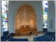 Der Andachtsraum ist durch ein Gewölbe überspannt, das ohne Stützen auskommt. Eine demokratische Struktur, alle Plätze haben gute Sicht auf den Altar. Die Glocken werden nicht mehr geläutet, seit 2008 eine der Glocken abstürzte und durch einen Stahlträger im Turm abgefangen wurde. Dort ruht sie noch heute, denn nur durch bauliche Öffnung des Turms könnte man an die Glocken herankommen.