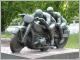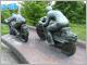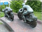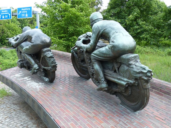 Auf einem BMW-Motorrad sitzt auch der eine der zwei Rennfahrer, die als Skulpturengruppe an der Avus-Einfahrt aufgestellt sind. Mit Helm und Brille, weit nach vorn gebeugt über ihr Motorrad, scheinen sie über die schräge Rennpiste zu rasen. Diese Plastik hatte Max Esser 1938 mit drei Motorradfahrern geschaffen. Einer ging verloren, denn die Gruppe wurde damals nicht aufgestellt, sondern bei der Bildgießerei eingelagert. Erst 2006 kam sie an ihren Platz.