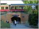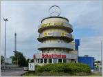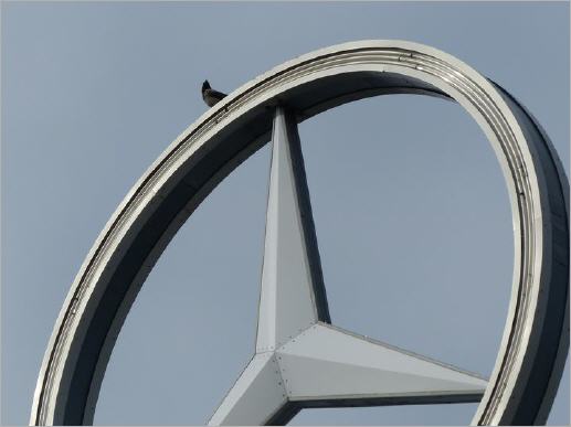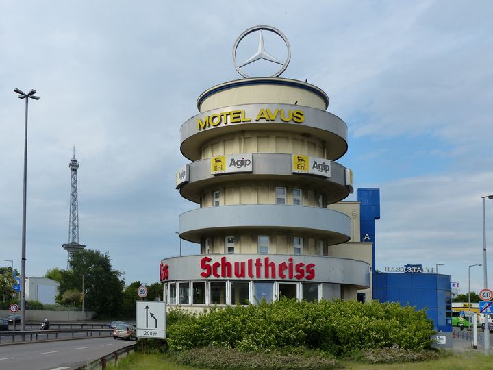 Zu West-Berliner Zeiten war für den privaten Autofahrer die Avus die einzige "Rennstrecke", auf der man aufdrehen durfte. Routine für das Autobahnfahren in Westdeutschland konnte man hier nicht entwickeln. Heute bröckeln die Avus-Tribünen vor sich hin, die Wendeschleife - ehemals Nordkurve - ist noch als Asphaltbahn vorhanden. Bei unserem Besuch fährt hier ein Modellbaufan mit seinem Flitzer Querfeldeinrennen, ein anrührendes Bild angesichts der Boliden (Rennwagen-Geschosse) zu früheren Zeiten. Der Innenraum der Nordkurve wird als Parkplatz für Busse und LKWs genutzt, der Rundturm mit dem Mercedes-Stern ist ein Motel geworden. Auf einem abgeteilten Randstück des Geländes üben Bogenschützen ("Achtung! Hier wird scharf geschossen").