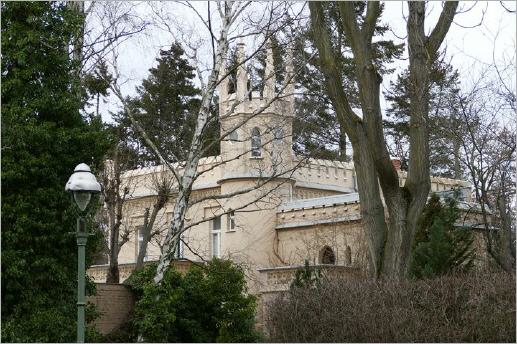 Eine burgartige Anlage mit Turm weist auch das Remisengebäude in der Klaus-Groth-Straße 9 auf, das - wie mehrere andere Bauten in Westend - von Alfred Schrobsdorff erbaut wurde, dem "Baukönig von Charlottenburg". -- In der Rüsternallee 18 steht ein gewitterblau angelaufenes Haus mit Turm, der Turm hat eine ungewöhnliche breite Krempe. Ein Draculahaus aus Transsilvanien? Hier wohnte der von manchen als Komiker bezeichnete Karl Dall.