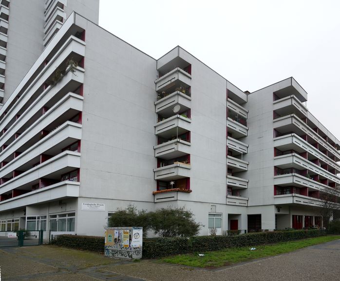Die skulpturale Form der Bauten rückt in den Fokus, wenn man die Ecke des inneren Hochhauskomplexes vor Augen hat mit den gleichmäßig horizontal gegliederten Balkonbrüstungsbändern, die in mehrere Richtungen auseinanderstreben. Der Architekt Heinrichs hat die Autobahnüberbauung der Schlangenbader Straße realisiert, das Märkische Viertel mit geplant und das Haus des Evangelischen Konsistoriums an der Bachstraße in Raumschiff-Architektur erbaut, das leider inzwischen durch einen profanen Neubau ersetzt wurde.