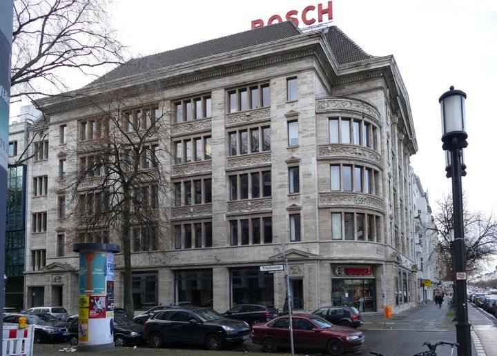 Bosch-Haus Ein ebenfalls mit Muschelkalk verblendetes fünfgeschossiges Eckgebäude aus der Berliner Elektropolis-Vergangenheit ist weiter westlich an der Fritschestraße erhalten geblieben, das 1917 errichtete Verkaufshaus der Robert Bosch GmbH. Die Fassade ist durch Pfeiler gegliedert, die jeweils mehrere Fensterachsen bündeln. Andererseits wird mit Reliefbändern unter den Fenstern der Bau horizontal betont. Zurückhaltender Reliefschmuck findet sich auch an den vier portalartigen Eingängen.