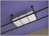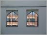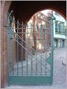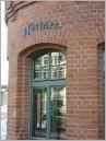 Der Eingangsbereich des Treppenhauses vermittelt trotz oder wegen seiner Dunkelheit einen schönen Blick auf die waagerechte Untergliederung der Eingangstüren und die runde Deckenlampe. In der Tordurchfahrt hängen schmiedeeiserne Lampen, die wie rechteckige Loren auf Schienen angeordnet sind.