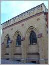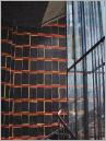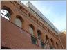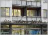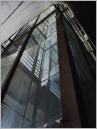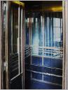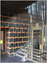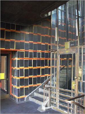 Im Treppenhaus des Seitenflügels finden sich weitere ungewöhnliche Ausstattungsmerkmale: Der Fahrstuhl fährt in einem gläsernen Schacht, der den Blick nach oben lenkt wie eine gotische Kathedrale. Die Wände des Treppenhauses werden durch schwarze Fliesen bestimmt, deren Fugen mit gelben und roten Linien und Feldern aufgelockert werden.