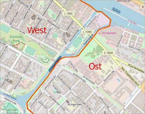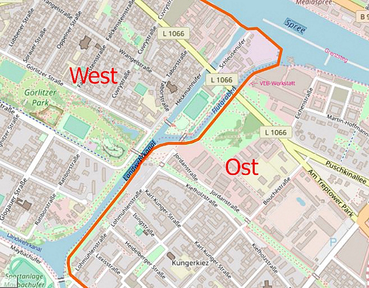 Die Grenze verläuft genau auf der Kante von Land und Wasser, wie baut man dort eine Mauer, um Flüchtlinge aufzuhalten? An der Lohmühleninsel hatte die DDR Schwierigkeiten, ihre "Staatsgrenze" nach West-Berlin abzudichten. Und im angrenzenden Kungerkiez verlief die Bezirksgrenze so im Zickzack, dass man im Westen Trampelpfade durch die Vorgärten anlegte, damit der Ost-Berliner Bürgersteig vor dem Haus nicht betreten werden musste.