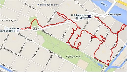 Die Schlesische Straße und das May-Ayim-Ufer haben sich 1987 durch einen Skulpturenweg in eine "Menschenlandschaft" verwandelt. Hier wurden die Werke von sieben Bildhauern installiert, an denen wir unseren Rundgang von der Hochbahn am Görlitzer Bahnhof zur Hochbahn am Schlesischen Tor beenden. Noch ein Stück die Wrangelstraße hinauf finden wir für unser Flaniermahl in der Markthalle an der Pücklerstraße das richtige Lokal für Käsespätzle und Bier bzw. Wein. Als wir eintreten, sind wir fast die einzigen Gäste, schon eine halbe Stunde später ist kein Platz mehr frei, der Saal brummt.