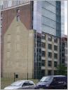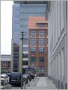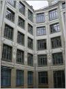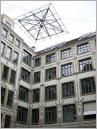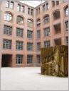Die vier Innenhöfe sind großzügig angelegt, anders als bei den Altberliner Mietkasernen. Jeder Hof wurde beim Umbau für die Oberbaum-City mit einem dreieinhalb Meter hohen Tuffsteinblockwürfel versehen. Diese Blöcke werden sanft mit Wasser berieselt und sind inzwischen mit einer Schicht von Moosen und Algen überzogen. Ein Hof enthält ein zwischen den Gebäuden schwebendes Glasdach. Die Kontrast der alten und neuen Fassaden und Gebäude erinnert mich an amerikanische Großstädte.