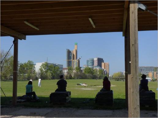 "Grün Berlin" hatte zur Parkführung eingeladen, und plötzlich standen am Sonntag Nachmittag hundert Berliner zum Erstaunen der mit der Führung betrauten Mitarbeiter vor dem Zaun und wollten schauen, was dahinter geschieht oder geschehen soll. Zu sehen war noch nicht viel, aber zu den Wortschöpfungen der Landschaftsarchitekten und Stadtplaner konnte man sich Phantasien machen: "generationsübergreifend", "interkulturell", "unterirdische Bewässerung", "Fahrradweg Berlin-Leipzig", "Generalszug-Brücke". Heute noch eine Stadtbrache, soll der Park einmal Teil eines Grünzuges vom Regierungsviertel zum Schöneberger Eisenbahn-Südgelände (1) werden und "in das überregionale Radwegekonzept eingebunden werden". Daher auch "die Wege der zwei Geschwindigkeiten", nämlich für Fußgänger und für Radfahrer. Diese Sprache ist so blumenreich wie vietnamesische Ortsbezeichnungen, ich erinnere mich an den "See des zurückgegebenen Schwertes", den "Fluss der Wohlgerüche", den "Wolkenpass", die "Bucht des absteigenden Drachen".