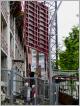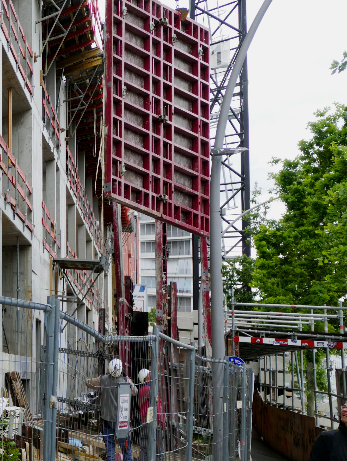 Als wir auf Höhe der Baustelle sind, bringt der Sturm ein schweres Bauelement am Kranhaken heftig zum Schleudern, es schlägt gegen die Baustelle und die Straßenlaterne, nur mit Mühe können zwei unerschrockene Bauarbeiter es schließlich einfangen. Puh, das ist nochmal gutgegangen.