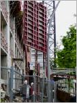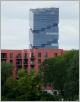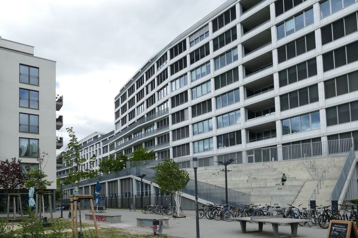 Bürogebäude "B:Hub" Das Bürogebäude "B:Hub" ist ein Langer Jammer von 300 m Länge entlang der Kynaststraße. Es ist bis zu 11 Etagen hoch, aber diese Megastruktur ist geschickt gegliedert. Mehrmals leicht abgeknickt schmiegt es sich an den Bahnkörper der Görlitzer Bahn an. Die Nähe zum Bahndamm wird bewusst als Lärmpuffer für die Nachbarbebauung genutzt. Ob an den bahnseitigen Büros bei starkem Zugverkehr nur "Pufferküsser" (Bahnfreunde) ihre Freude haben? Von einem auf der anderen Seite vorgesetzten einstöckige Gebäuderiegel breitet sich eine Treppe aus, die wie ein Amphitheater wirkt und zu Geselligkeit einlädt.