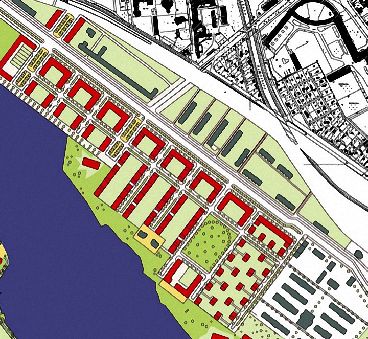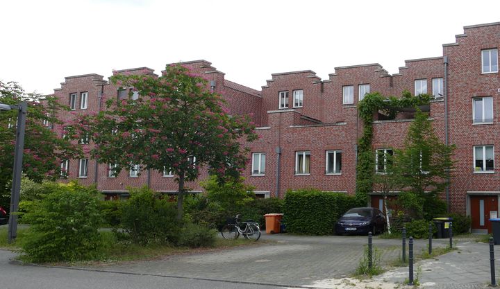Townhouses Der Medaillonplatz wird von Townhouses umstanden. Das sind städtische Reihenhäuser, deren Wirkung eigentlich auf ihrer Unterschiedlichkeit beruht, im Idealfall sind sie nicht gleichförmig. Wenn serielle Bauten unter einer einheitliche langen Front zusammengefasst werden, geht dieser Charme einzelner Häuser verloren. Am Medaillonplatz wurde diese Chance vertan, die den Holländerhäusern nachempfundenen roten Backsteinreihen wirken eintönig. Südlich davon am Bolleufer wechseln sich zwei Bautypen ab mit unterschiedlicher Gebäudehöhe und Farbigkeit, ein lebendigeres Bild.