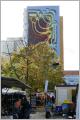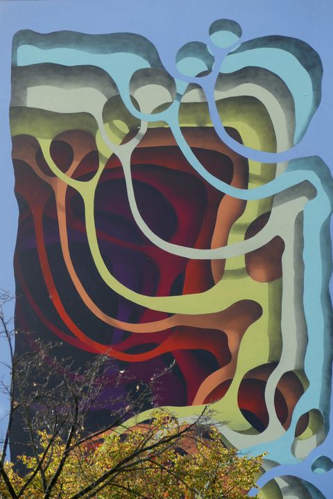 Der Streetart-Künstler "1010" - gesprochen eins null eins null - hat ein großformatiges abstraktes Wandbild am Platz geschaffen, das wesentlich dynamischer ist als der Arbeitstitel "Tropfen und Ringe". Die Wohnungsbaugesellschaft HOWOGE finanziert mit ihrer Initiative Lichtenberg Open ART mehrere Murals (Wandbilder) im Bezirk Lichtenberg.