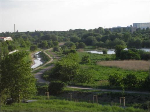 Wir sind vom Friedenspark aus auf den Kienberg gestiegen, sind dann an der Wuhle südwärts gegangen und haben uns schließlich am Wuhleteich in der weiten Wiesenlandschaft durch Röhricht und Schilf gekämpft, bis wir wieder einen festen Weg unter den Füßen hatten. Wir hatten vorher eine Einheimische nach einem begehbaren Weg gefragt. Entweder haben wir die Antwort nicht richtig gedeutet oder sie hat uns Fremde in dem Sumpf geschickt, damit das Flanieren etwas abwechslungsreicher wird. Jedenfalls haben wir das Gewühle an der Wuhle heil überstanden und sind mit einem seltenen Einblick in das Biotop belohnt worden.