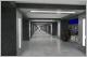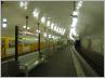 Sternenhimmel hinter den Arkaden Alle sprechen von "dem" Sternenhimmel, "der" Decke - in Einzahl. Tatsächlich sind es zwei Decken, die nicht miteinander verbunden sind, weder räumlich noch in einem gemeinsamen Blickfeld. Das liegt daran, dass die U-Bahnen in zwei getrennten Röhren ankommen und der Bahnsteig in deren Zwischenraum so hineingedrängt wurde, dass er beide Röhren optisch beiseite drängt. Damit nicht genug, fahren die Züge hinter einer 180 Meter langen Reihe von eckigen grauen Säulen, die vom Architekten zu "Arkadengängen" vor der Bahnsteigkante hochstilisiert werden. Oben über dem breiten inneren Bahnsteig füllen weiß verputzte Deckenfelder die von den Wandpfeilern vorgegebenen Rasterfelder aus. Es gibt keinen Versuch, die beiden Himmel miteinander zu verbinden.