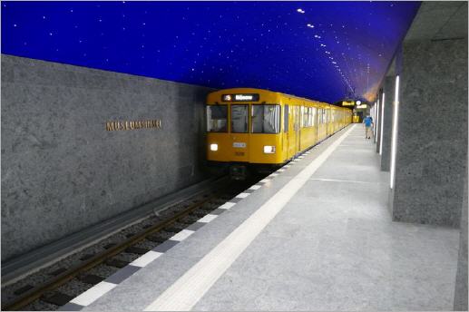 U-Bahnhof Museumsinsel Die Decke des Untergrundbahnhofs wölbt sich von Schiene zu Schiene. Sie bildet einen unendlichen Sternenhimmel; in dem ultramarinblauen Himmel glimmen lauter kleine Lichtpunkte. So vergisst man, dass der Bahnhof eigentlich nicht das Ziel der U-Bahnfahrt war. Es ist das "würdige Entree für das Weltkulturerbe Museumsinsel". Doch, aufgewacht aus dem Traum - der gerade feierlich eröffnete Bau bleibt hinter den Erwartungen zurück, die man in ihn setzen könnte.