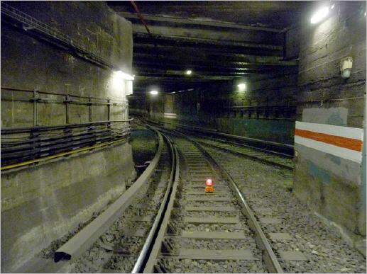 Das gleislose Tunnelbauwerk endet blind nach 100 Metern, man kann aber vorher unter den befahrenen Gleisen der U2 hindurch zum Klostertunnel laufen, der U-Bahngeschichte pur vermittelt. Auf der U2 sind Kleinprofilzüge unterwegs, die keine Betriebswerkstatt in Ostberlin erreichen konnten, dort fuhren Züge im Großprofil. Also brauchte man eine Abbiegung zur U5, an der die Betriebswerkstatt liegt. Die Gleis-Spurweite innen von 1,435 m ist glücklicherweise identisch, aber man brauchte einen Übergang zwischen den Stromabnehmern, die unterschiedlich gepolt sind und entgegengesetzt von unten bzw. von oben den Strom abgreifen.