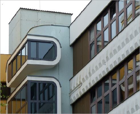 Von der Swinemünder zur Putbusser Straße führt eine "Schulstraße" durch das Gebäude aus den 1970er Jahren, die abgerundeten Wandelemente haben "soft-edges", die rahmenlose Fenster schließen plan mit der Fassade ab. Vor dem im Innern verbauten Asbest ist die Schule 2011 geflohen, sie hat in einem Altbau im Bezirk eine neue Heimat gefunden.