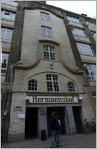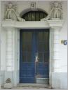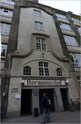 Wir sind vom U-Bahnhof Boddinstraße in den Kiez gelaufen. Auf dem Weg haben wir den Hermannshof besucht, einen Gewerbebau auf dem zweiten Hof des Grundstücks Hermannstr.48. Das unscheinbare Vorderhaus und der erste Hof wirken nicht so, als wäre hier etwas Interessantes zu entdecken, wir haben auch zwei Anläufe gebraucht, um das Gesuchte zu finden. Vom ersten Hof schaut man nach links auf einen Bau auf dem Nachbargrundstück, der wie ein Bunker aussieht, sich aber als Ziegelbau unter einem grauen Putz herausstellt und deshalb für diesen Zweck nicht die nötige Stabilität geboten haben dürfte. Erst der nächste Hof zeigt dann den Fabrikbau mit dem ungewöhnlich gestalteten Jugendstil-Portal. Der Mittelteil mit dem Eingangsbereich ist etwas aus der Fassade hervor gezogen, die drei Türen und darüber ein Band von drei Fenstern werden gemeinsam umrandet, als Bekrönung ruhen zwei Kugeln auf dem Gesims.