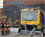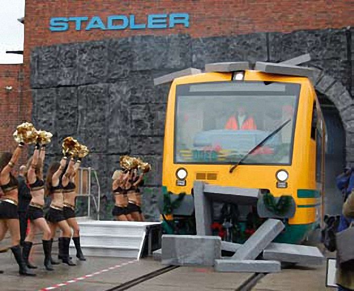 Die Auslieferung eines Zuges an eine Bahngesellschaft hat Stadler in Szene gesetzt mit einem Triebwagen, der eine Sperre aus Styropor-Mauersteinen durchfährt. Dazu tingeln Cheerleaderinnen (professionelle Anfeuerinnen) neben den Gleisen und wedeln mit bunten Puscheln in der Luft. Welche Sportart wurde denn dort gefeiert, welche Sportler bejubelt?