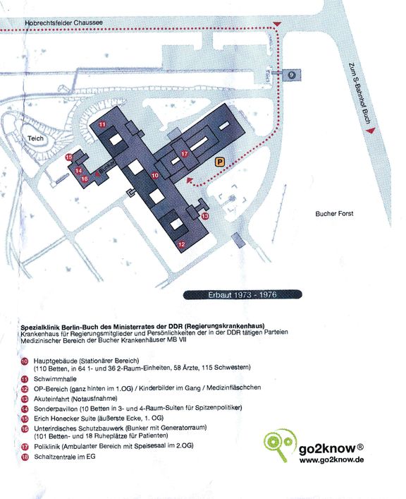 Auf den Stationen gab es 110 Betten, hier waren 58 Ärzte und 118 Schwestern tätig. In einem Sonderpavillon mit 10 Betten logierten die VIPs unter den Funktionären, also die Honecker-Crew. Es war ein Anbau auf der Gartenseite, der nicht von den Eingängen aus eingesehen werden konnte. Es hat alles seine zwei Seiten: Wie auf der Protokollstrecke Richtung Wandlitz bekam Honecker so auch nur das zu sehen, was man ihm zeigen wollte.