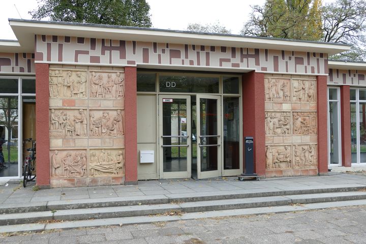 Kunsthochschule Weißensee In das freigeräumte Verwaltungsgebäude der Trumpf-Fabrik zog 1956 die Kunsthochschule Weißensee ein. Die Kunstdarstellungen im und am Gebäude im Stil des sozialistischen Realismus' verweisen auf diese Periode. Am Eingangstrakt, der den alten Gebäuden vorgesetzt wurde, wird man von Keramikreliefs mit "Szenen aus dem Hochschulleben" begrüßt. Die 12 Werke eines an der Kunsthochschule lehrenden Dozenten zeigen beispielsweise Maler, Skulpteure, Steinbildhauer bei der Arbeit.