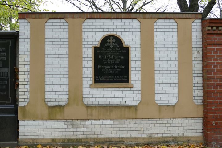 Ein gekacheltes Grabmal Aus hygienischen Gründen sind Räume einer Fleischerei gekachelt. deren Ladengeschäfte erkennt man auf den ersten Blick. Merkwürdig mutet es an, wenn Fliesen auf einem Grabmal anzeigen, dass hier ein Fleischer beerdigt wurde. Auf dem Friedhof Georgen-Parochial III in der Roelckestraße ist die Rückwand eines Erbbegräbnisses weiß gekachelt, vier stilisierte Säulen deuten einen Raum in einem Gebäude an. Beerdigt wurde hier 1896 laut Grabinschrift ein "Schlächtermeister".
