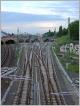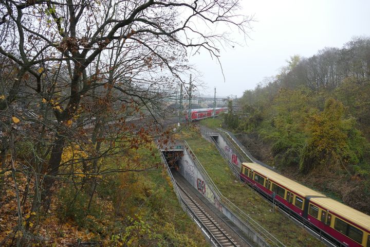 Wie bei den Brauereien, die ihre Lagerkeller von der Hangseite statt von oben in den Barnim einbohren konnten, waren auch die Tunnel leichter anzulegen. Der Blick von Süden Richtung Gesundbrunnen zeigt eine verwirrende Zahl von Gleisanlagen auf unterschiedlichen Ebenen. Und sie dehnen sich aus, der südliche Tunnel auf der Strecke Nordbahnhof - Gesundbrunnen ist 120 Meter lang, der nördliche Tunnel Richtung Bornholmer Straße 100 Meter.