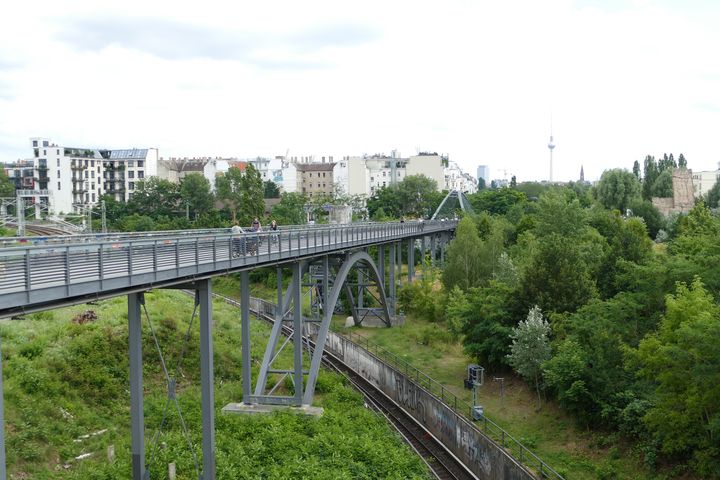 Schönfließer Brücke Als Provisorium wurde die 60 m lange Fußgängerbrücke 1945 auf eigenen Widerlagern gebaut, um einen Übergang anstelle der kriegszerstörten Schönfließer Brücke zu schaffen. Vergessen ist die großzügige Straßenbrücke, die der U-Bahn-Architekt Alfred Grenander "für den Auto- und Kutschenverkehr" erbaut hatte, sie fiel einer Luftmine zum Opfer. Das Provisorium dauert an, inzwischen etwas marode geworden verbindet es weiterhin über den Graben der Ringbahn Prenzlauer Berg mit Prenzlauer Berg. Hier war vor 130 Jahren "der Übergang von Stadt und Land, fast genau der Nordpol der Stadt. Hier ist Berlin theoretisch zu Ende. Davor lagert ein Müll-Ring, Strandgut wie Scherben und altes Eisen, alles was Berlin nicht mehr brauchen kann".