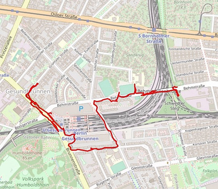 Mit unserem heutigen Rundgang versuchen wir, die Bahntrassen am Bahnhof Gesundbrunnen als Fußgänger zu überwinden. Dabei werden Brücken zum Thema, aber auch die Bahnkörper selbst. Wie ein Lasso schnürt die Ringbahntrasse die Innenstadt ein, legt sich als Hindernis, als Barriere um das Stadtzentrum Berlins. Als sie in den 1870er Jahren eingerichtet wurde, lag die Ringbahn noch außerhalb der Vorstädte des alten Berlins, Groß-Berlin wurde erst 1920 geschaffen. Am Bahnhof Gesundbrunnen kreuzt die Ringbahn die Nordbahn, die gleichzeitig in nördlicher Richtung die Grenze zwischen Wedding und Prenzlauer Berg bildet und damit seit 1961 als Mauerstreifen unüberwindbar war, bis an der Bornholmer Straße 1989 das Wunder des Mauerfalls begann.