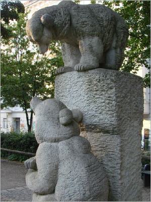 Und dann der Helmholtzplatz, das Leben unter dem Balkon drängt sich geradezu auf bei der Anzahl dieser Bauteile, die auf den Platz herunterschauen, wobei erstaunlicherweise im Moment niemand auf einem Balkon anzutreffen ist. Das Thema ist aufgerufen, meine Kamera sucht ganz von selbst die Motive und plötzlich sind fast alle Balkons abgelichtet. Im Park spielen wieder Bären, diesmal aus Stein gehauen.