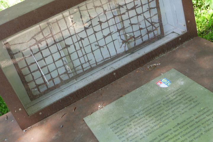 Der Bachlauf wurde mit einer Wassersperre gesichert. Unter diesem harmlosen Begriff verbirgt sich eine mittelalterlich anmutende, perfide Dornenmatte, deren 10 cm lange Stacheln die schwersten Verletzungen hervorrufen konnte. Diese Matten wurden in die Gräben und Uferböschungen eingelassen. 38.000 dieser "Stalinrasen" wurden nicht nur im Tegeler Fließ, sondern rund um West-Berlin im Todesstreifen ausgelegt.