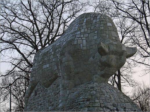 Alboinplatz Der Helspfuhl liegt mitten im Alboinplatz zwischen Schöneberg und Tempelhof. Eine Stier-Statue hält die Geschichte, die sich mit diesem Weiher verbindet, lebendig. Gebaut wurde die Statue 1936 als Arbeitsbeschaffungsmaßnahme im Dritten Reich. Entworfen wurde der Stier von Paul Mersmann, dessen Büste des Kunsthändlers Pels-Leusden heute im Käthe-Kollwitz-Museum steht. Die Steine sollen aus dem Vorgängerbau des Reichsluftfahrtministeriums stammen (das ist das Gebäude an der Wilhelmstraße, in dem heute das Finanzministerium sitzt). Vor 2 Jahren wurde der aus 3.000 unregelmäßigen Werksteinen bestehende Stier restauriert.