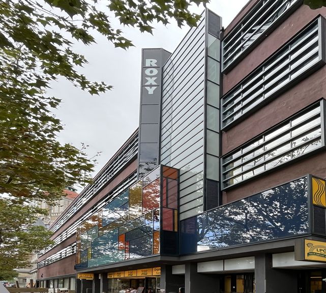 Roxy-Palast Der Roxy-Palast - ein Geschäftsgebäude mit namensgebenden Lichtspielhaus - ist ein Stahlskelettbau. Das Erdgeschoss ist komplett verglast mit Schaufenstern und Glastüren. Die Fassade wird gegliedert mit langgestreckten, durchlaufenden Fensterbändern, die als "Filmstreifen" die Kinofunktion nach außen projizieren. Ein Lichtkasten wie ein Gemälde von Piet Mondrian und ein haushoher weißer Lichtturm über dem Kinoeingang sind ein Blickfang. Mit der Leuchtreklame wurde gleichzeitig über das Kinoprogramm informiert.