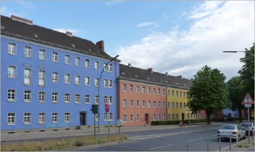 Ganze Häuserzeilen in der Nähe des Attilaplatzes sind wie mit dem Tuschkasten bemalt, auch in der Attilastraße. Bruno Tauts Tuschkastensiedlung liegt in Falkenberg, sollte er hier auch ...? Ja, er hat hier gebaut, aber die farbigen Häuser sind nicht von ihm. Die Taut'schen Häuser liegen gegenüber auf der Attilahöhe, zwischen Tankredstraße, Paul-Schmidt-Straße und Attilastraße, und sind nicht farbig, sondern werden durch Klinkertürme und Glasflächen überraschend plastisch geformt. In der Form eines Kinderspielzeug-Kreisels, der sich auf seiner Spitze dreht, umschließen die Straßen die Wohnbebauung. Mitten drin liegt ein lauschiger Wohnhof, der in Parzellen unterteilt ist, als wären es Kleingärten. In den Innenhof hinein gestellt hat Taut einen eingeschossigen Bau mit viel Glas, der Läden, einen Kindergarten, die Heizzentrale und eine Wäscherei enthielt. In der Tankredstraße wird der Gemeinschaftsbau durch eine breite Glasfläche nach außen gespiegelt. Außer dem monumentalen Bau mit den fünf massigen Klinkerschornsteinen hat Taut hier weitere schlichte Etagenhäuser errichtet, die Schließung des Baublocks erfolgte später durch andere Architekten.