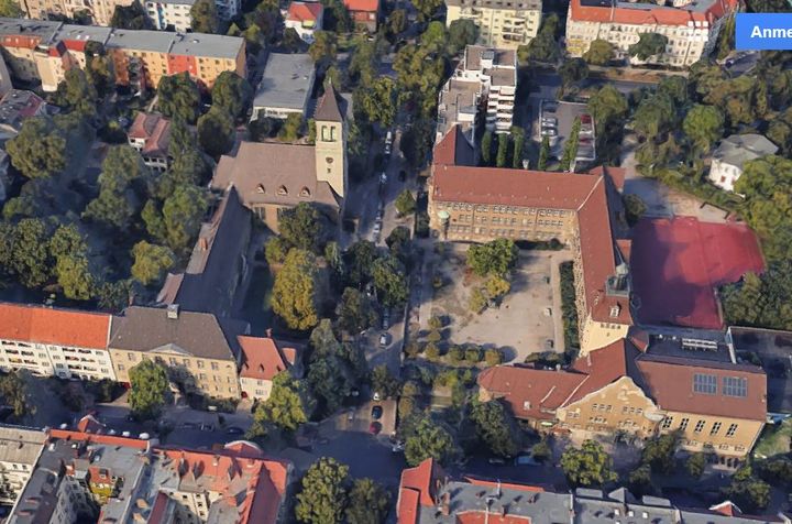 Kirche und Schule liegen an der Friedrich-Franz-Straße gegenüber. Die Gebäude sind jeweils zur Straße hin U-förmig um einen Vorhof angeordnet. Beide Vorhöfe bilden über die Straße hinweg und quer zu ihr einen Platz, der als Figur im Stadtgrundriss prägend ist, aber nicht öffentlich begangen werden kann, weil der Vorhof der Schulgebäude als Schulhof dient. Wie die Kirche hat auch das Schulgebäude einen Turm. Dort war natürlich keine Glocke installiert, sondern ein Foucaultsches Pendel, das die Erdbewegung demonstrierte.
