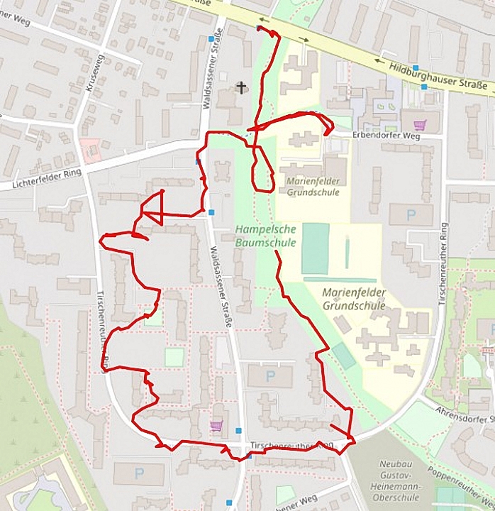 Großsiedlung Waldsassener Straße Für die nicht ganz so große Großsiedlung Marienfelde-Süd wurden südlich der Hildburghauser Straße auf landwirtschaftlichen Flächen des Dorfes Marienfelde die Waldsassener Straße und der Tirschenreuther Ring neu angelegt, beide umfassen das Baugebiet wie ein Dreispitz. Der Lichterfelder Ring, der ursprünglich an der Hildburghauser Straße endete, wurde um 80 Grundstücke verkürzt. Dadurch beginnt seine Zählung heute erst mit der Hausnummer 81. Das Terrain der 1943 ausgebombten Baumschule Hampel am Lichterfelder Ring 57 ging dadurch in städtisches Eigentum über und konnte in eine Grünfläche einbezogen werden. Für die neue Großwohnsiedlung brachte das den Vorteil, dass sie über einen alten Baumbestand verfügt.
