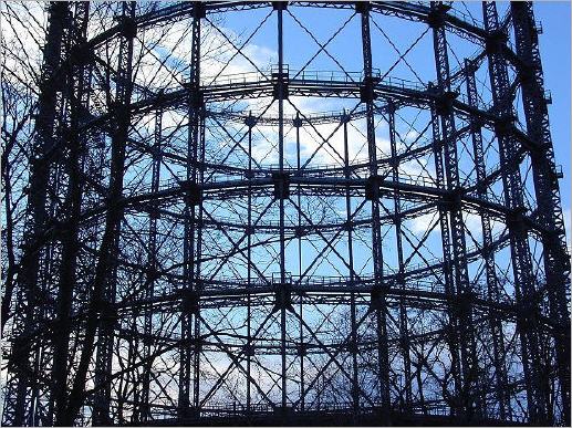Die Insel wird geprägt von dem Gasometer, das als Vorratsbehälter für Stadtgas bis 1995 in Betrieb war. Das Führungsgerüst ist 80 m hoch, in ihm bewegt sich der eigentliche Gasbehälter aus genieteten Blechplatten, dessen vier Hübe sich je nach Füllungsgrad teleskopartig zusammenschieben bzw. auseinanderziehen. Die Befürchtungen, ein Unfall könne einen Super-Gau erzeugen, erfüllten sich gottlob nicht. Heute soll hier ein Veranstaltungsort entstehen. Geben wir noch Günther Grass das Wort zum Thema "Der Gasbehälter" (Gesammelte Gedichte, 1971):