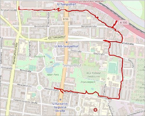 > An der Ecke Manteuffelstraße haben wir unseren Rundgang durch die Ringbahnstraße beendet. Westlich davon liegt das Reichspostzentralamt, zu dem sie dieser Spaziergang Richtung Alboinplatz führt: Drei Eiszeiten - eine Stadt