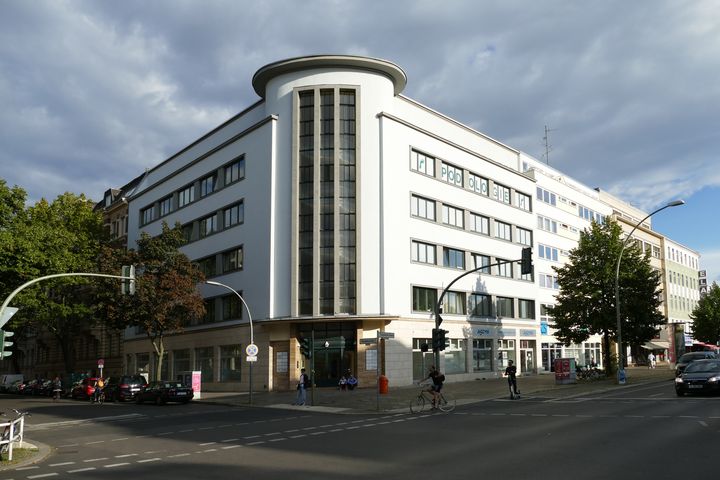 Nachkriegsmoderne: Das Eckhaus Was für eine gelungene Ecklösung! Das markante Bürogebäude am Zusammentreffen von Ringbahnstraße und Tempelhofer Damm könnte Geschäftshausarchitektur der 1920er Jahre sein, wurde aber tatsächlich 1950 entworfen. Die Fenster an den beiden Seitenstraßen laufen mit horizontalen Bändern auf den zylindrischen Baukörper an der Ecke zu, der eine vertikale Gliederung aufweist.