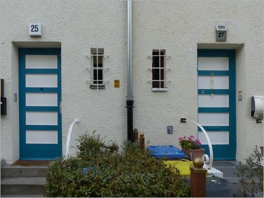 Am nordöstlichen Rand der Reichsforschungssiedlung sind Reihenhäuser errichtet worden. Die ursprünglich „wasserblauen“ Klappläden vor den Fenstern mit "verkehrsweißen" Lamellen sind - wie auch andere Teile der Häuser - oft von den Bewohnern verändert worden, hier kam der Denkmalschutz teilweise zu spät. Inzwischen wird durch einen Maßnahmenkatalog für zukünftige Veränderungen die denkmalgerechte Gestaltung vorgeschrieben.