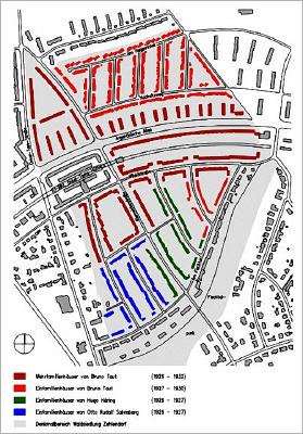 Onkel-Tom-Siedlung In der Großsiedlung Onkel-Toms-Hütte entstanden nördlich und südlich der Argentinischen Allee Einfamilien-Reihenhäuser und in ihrer Mitte Mietwohngebäude. Der Kiefernbestand des Grunewalds wurde in die Siedlung einbezogen. Öffentlicher Grünraum und Mietergärten bilden optisch einen "Außenwohnraum" zu den Wohnungen. Schmale öffentliche Wirtschaftswege erschließen die Hausgärten von der Rückseite. Die Farbigkeit der Häuser mit horizontalen und vertikalen Gliederungen wird von Taut anstelle eines Ornaments eingesetzt. Eine Denkmalsatzung verhindert erfreulicherweise, dass auf die Fassaden Wärmedämmung aufgebracht wird. Die äußeren Rahmen der historischen Kastendoppelfenster sind ebenfalls nach einem Farbkonzept abwechslungsreich gestaltet und dürfen nicht verändert werden. Dagegen können die Bewohner die Terrassen auf der Hausrückseite mit Wintergärten oder Veranden überbauen.