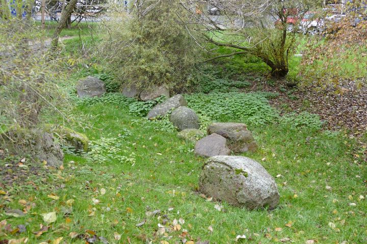 Am Bäkequell Die Grünfläche "Am Bäkequell" mit ihrer Vertiefung und vielen Findlingen lässt heute noch den Quellbereich erahnen, Wasser sieht man hier nicht mehr. Wenn im Stadtplan auf der Grünfläche ein "Saurier im Urstromtal" genannt wird, dann handelt es sich um eine mäßig angsteinflößende geschnitzte Holzfigur auf dem Spielplatz. Schüler der nahegelegenen Blindenschule haben an der Gestaltung des Spielplatzes mitgewirkt, Blinde können sich durch Orientierungstafeln in Blindenschrift und Seile als Handläufe auf dem Platz orientieren.