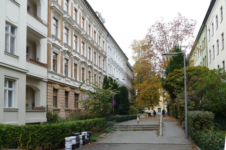 "Viktoria-Park", Rondell Ahornstraße Auf dem Weg zur Ahornstraße kommen wir durch eine Passage, die an der Zimmermannstraße beginnt und nur in der Denkmaldatenbank den Namen "Viktoria-Park" trägt. Ein durchgehend gepflasterter Weg mit üppigen grünen Vorgärten und einzelnen Bäumen führt durch die Häuserblocks hindurch. Die Passage führt auf die Ahornstraße, die sich in ihrem Verlauf mittendrin zu einem Rondell öffnet.