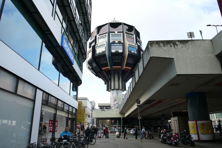 Bierpinsel Über der Schildhornstraße schaut der Bierpinsel aus 46 Meter Höhe auf die hier kreuzende Stadtautobahn herunter. Der aus der Form eines Baumes entwickelte Bau ist ein Gesamtkunstwerk der 1970er Jahre in Sichtbeton und anfangs mit knalligen Farben. Vierzig Jahre später wurde nach einem Eigentümerwechsel am Bierpinsel ein Farbexperiment gewagt, das heute nicht mehr sichtbar ist. Jetzt greifen schwarze Formen auf der Fassade um sich, dunkel hängt der Bierpinsel wie ein Ballon über den geschäftigen Menschen auf der Schloßstraße.
