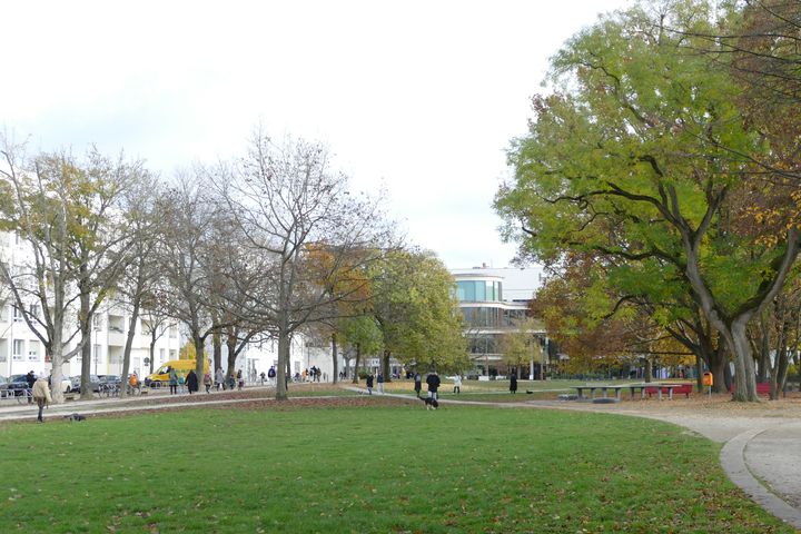 Die Parkanlage mit altem Baumbestand ist neugestaltet worden, ein Pocket-Park entstand, ein "kleiner Freiraum im städtischen Kontext". Dabei hat man die alten Trampelpfade zu offiziellen Wegen gemacht. Das ist eine Erfahrung von Landschaftsplanern: Bürger folgen eckigen Wegeführungen nur bis zu einem gewissen Maße. Wenn es ihnen zuviel wird, kürzen sie einfach ab. So bilden sich Trampelpfade, die auch vor Grünflächen nicht Halt machen. Also ist es klüger, von vornherein organische Wegführungen vorzusehen, die auch von den Menschen angenommen werden.
