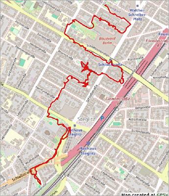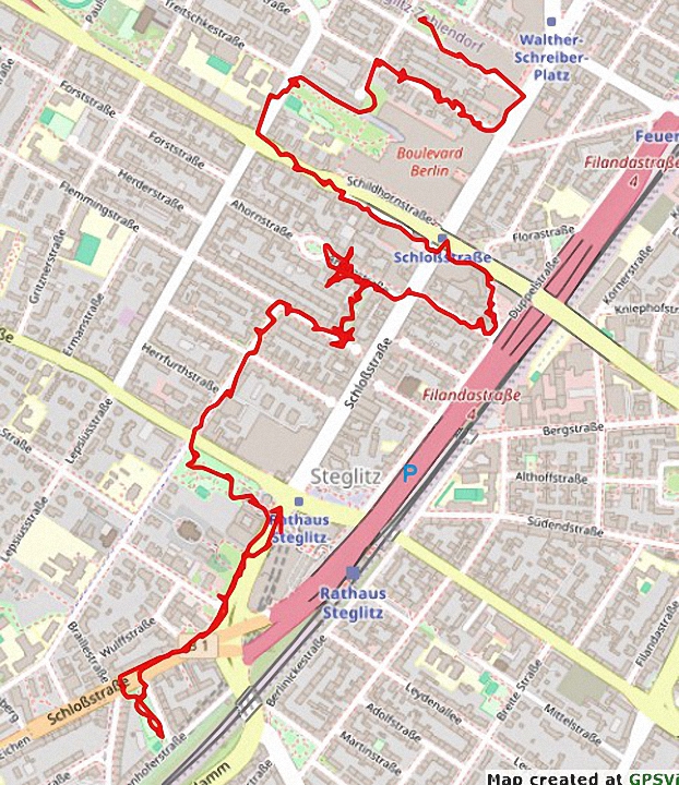 Die Steglitzer Schloßstraße mit Gutshaus, VW-Pavillon, Schwartzscher Villa, Titania-Palast und Bierpinsel hatten wir schon mehrfach im Fokus, auch als Einkaufsstraße und als nächtliche menschenleere Straße (*). Heute ist der Einzugsbereich interessant, dabei stoßen wir auf erstaunlich viele Grünanlagen. Keine Parks, aber eingestreute Erholungsflächen.