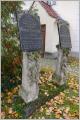 Kirchhof und Gemeindefriedhof Die Dorfkirche ist von einem Kirchhof umgeben, auf dem mehrere ungewöhnliche Grabsteine zu finden sind: Aufrecht stehende Stelen, im oberen Bereich mit einer schräg angebrachten Inschrifttafel, die den Text ins Blickfeld bringt, ohne dass man sich herunterbeugen muss. Solche "Pultsteine" (ähnlich einem Stehpult) haben eine lange Historie, wir haben sie aber noch nie gesehen auf Berliner Friedhöfen.