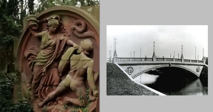 Als zur Vorbereitung der Gewerbeausstellung von 1896 der Ort Treptow näher an Berlin angebunden werden sollte, wurde die Wiener Straße über den Landwehrkanal verlängert bis zur heutigen Karl-Kunger-Straße (damals Wiesenufer). Die Wiener Brücke war mit vier Reliefs aus rotem Sandstein geschmückt. Der Pergamonaltar war gerade in Kleinasien ausgegraben worden, deshalb machte der Bildhauer Szenen aus dem Altar zum Thema, nämlich aus dem Gigantenfries den dramatischen Kampf der griechischen Götter mit den Giganten. 1945 sprengte die deutsche Wehrmacht die Brücke, um den Vormarsch der Sowjets aufzuhalten (vergeblich). Zwei der Friese überstanden die Sprengung, sie wurden - warum auch immer - nach Heiligensee umgesetzt. Jedenfalls wurde man dort nicht mehr an die unsinnige Sprengung erinnert.
