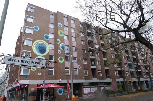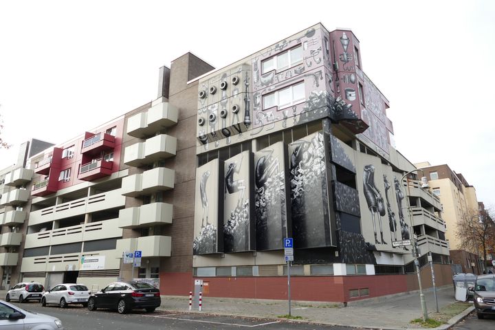 An der nächsten Ecke Kirchbachstraße wurde in der Sanierungszeit ein viergeschossiges Parkhaus mit aufgesatteltem Wohnhaus errichtet. Es enthält die "erforderlichen Autostellplätze für das gesamte Sanierungsgebiet" sowie 16 Wohnungen. Mit einer Fülle von Formen und Betonelementen ist es schon für sich ein architektonisches Highlight der Nachkriegsmoderne, hinzu kommt, dass es in ein surreal anmutendes Street-Art-Kunstwerk verwandelt wurde.